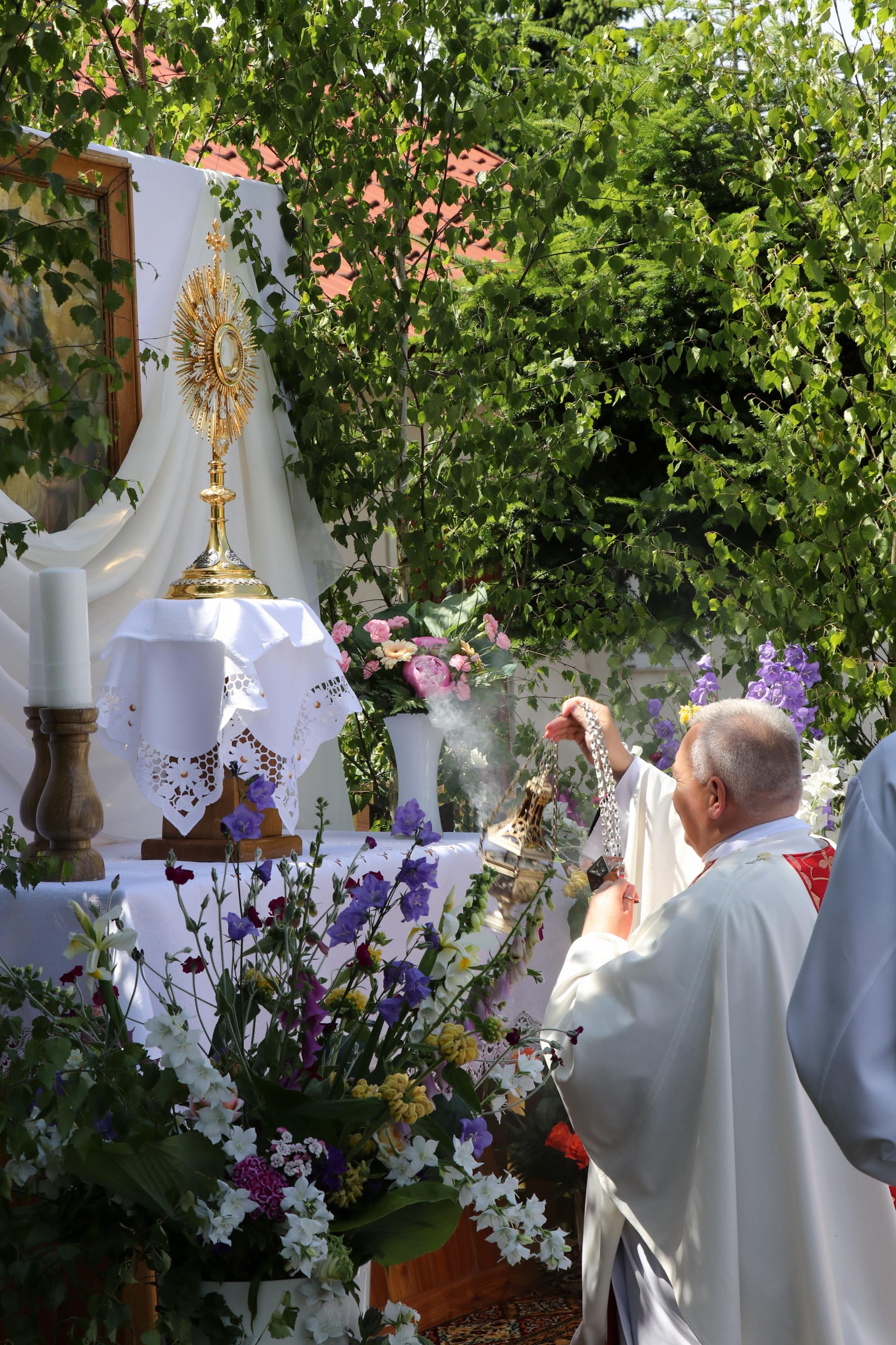 Uroczystość Bożego Ciała i oktawa, która następuje po niej, w naszej parafii ma szczególny wymiar. Jak wszędzie — procesja to pełen kolorów i symboli ciąg ludzi, którzy przez różne znaki i formy liturgiczne oddają cześć Bogu. Niesione chorągwie, sztandary, feretrony, sypanie kwiatków przez dzieci, dźwięk dzwonków — to stałe elementy tych dni.
