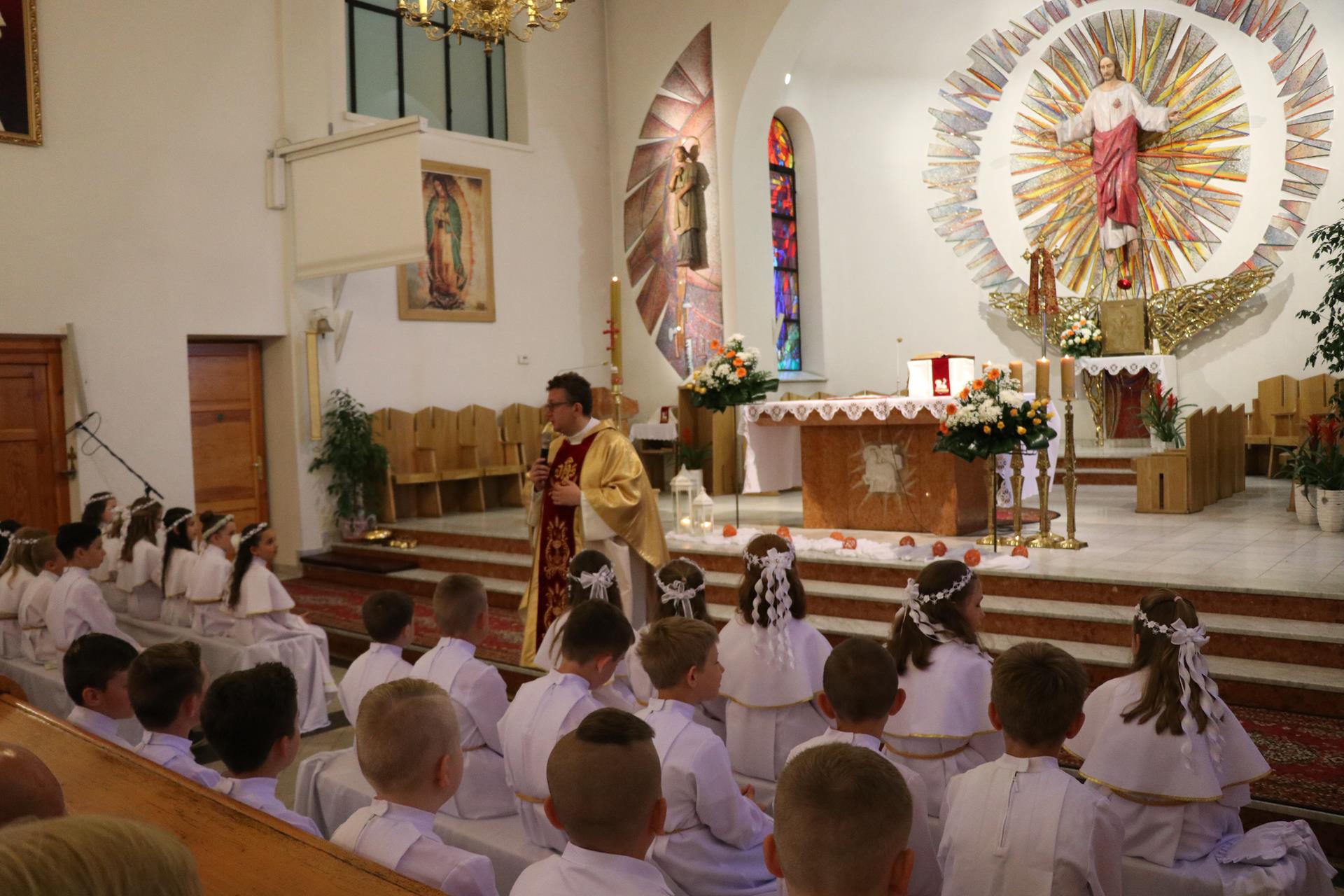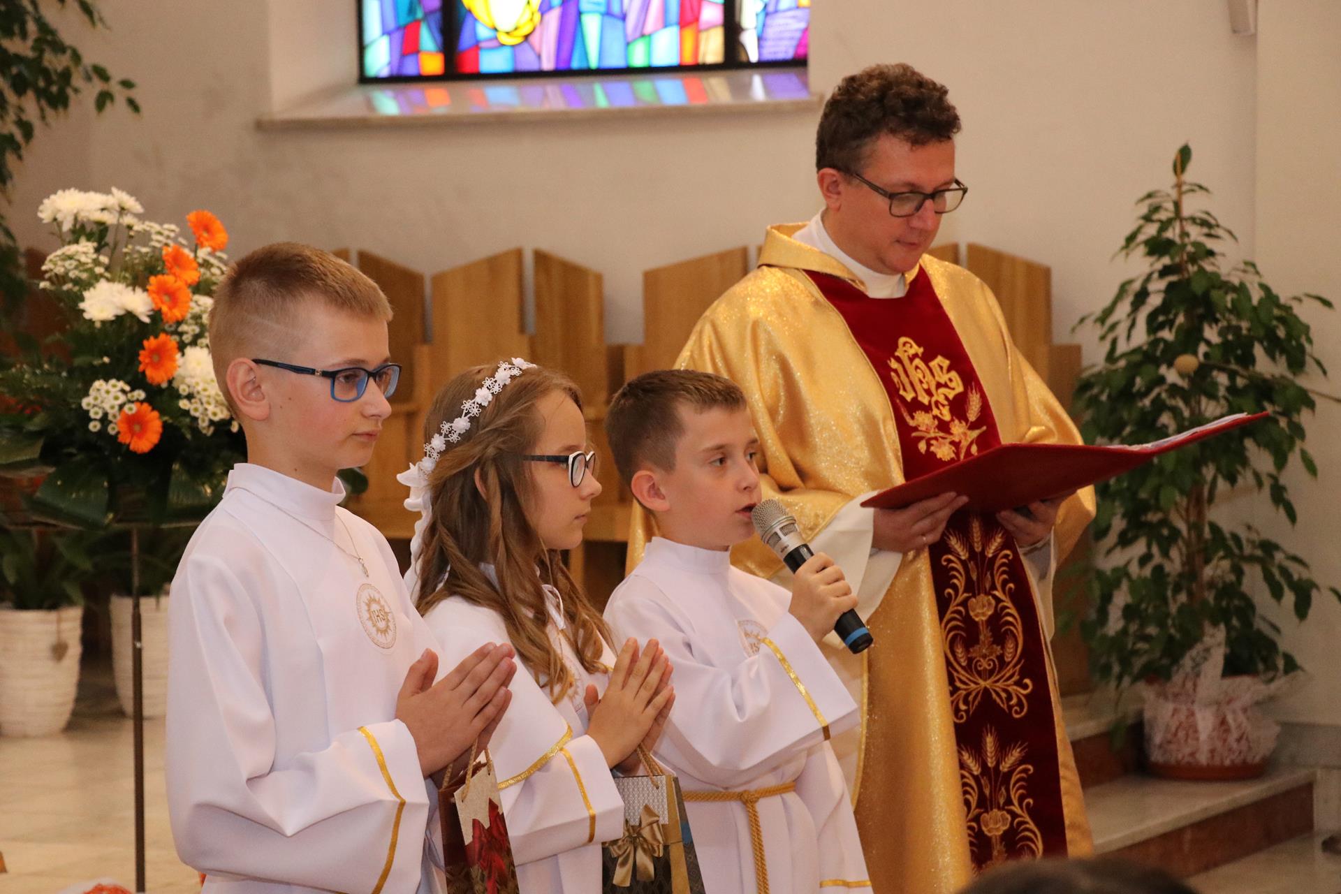 Uroczyste wejście do kościoła, dziękczynienia dla Boga, rodziców, księży, nauczycieli. Komunijne stroje, które — choć często już trochę przymałe — były jednak czymś, co wyróżniało ten dzień i tę Mszę świętą. W homilii ksiądz Jarek mówił o wydarzeniu Wniebowstąpienia Pana Jezusa, ale także przygotował do aktu poświęcenia się Sercu Jezusowemu.