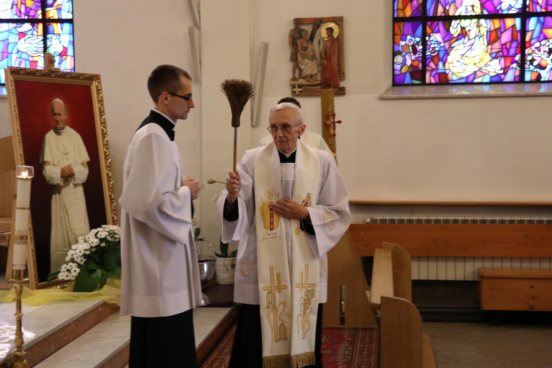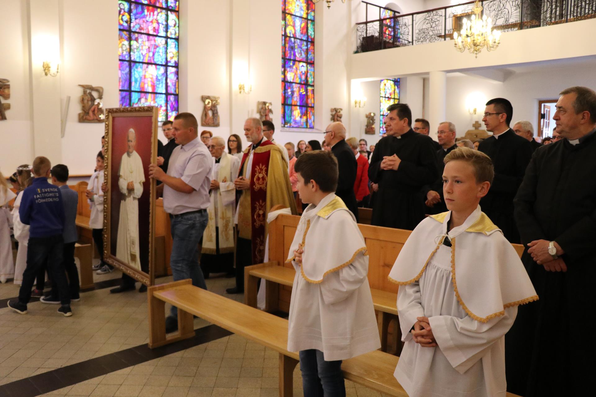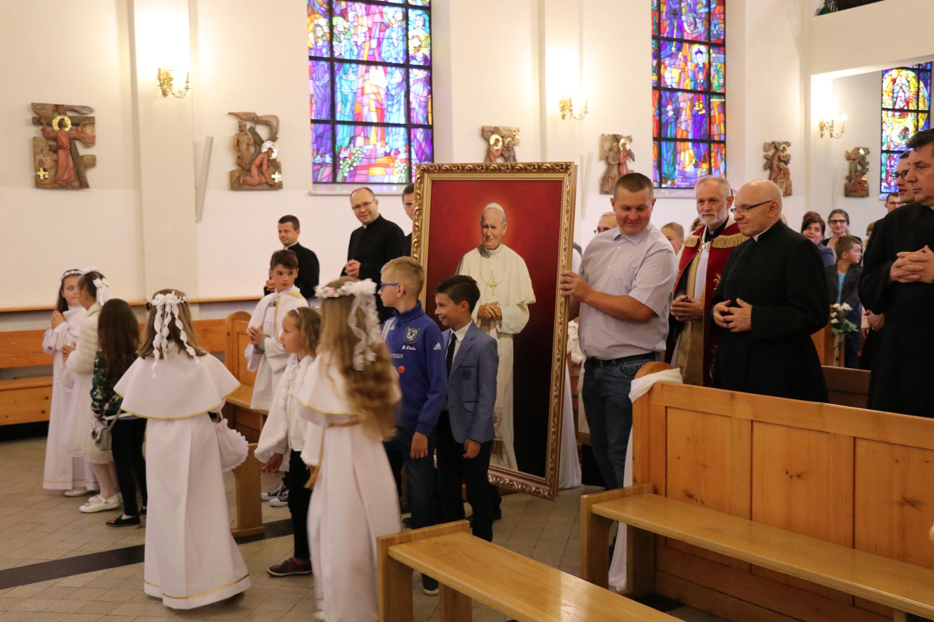 Rodzice dzieci pierwszokomunijnych oraz same dzieci byli tymi, którzy wprowadzili obraz do świątyni; poświęcenia dokonał ksiądz Józef, a następnie wraz z Janem Pawłem w jego wizerunku czciliśmy Serce Boże przez śpiew litanii. Msza święta odprawiona była pod przewodnictwem księdza proboszcza Kazimierza Lewandowskiego SCJ. W homilii złoty jubilat, wracając do chwil pobytu kardynała Wojtyły w Stadnikach, przypomniał główne przesłanie jego homilii mówiące o kulcie Serca Jezusowego, roli naszego zgromadzenia w krzewieniu tego kultu, oraz swoiste "proroctwo", jakie wypowiedział ówczesny przełożony księży sercanów, które miało dotyczyć przenosin księdza kardynała do Warszawy, by objąć urząd po kardynale Stefanie Wyszyńskim. Po ponad czterech miesiącach okazało się, że kardynała Karola Wojtyłę przyszło nam rzeczywiście pożegnać z naszej krakowskiej ziemi, bo został wybrany papieżem Janem Pawłem II.